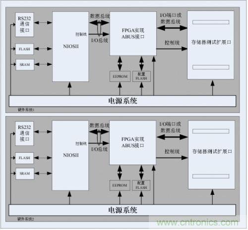 在測試NAND FLASH時,測試時間長達十個小時不等。在此為提高測試效率,增加測試速度,本設計采用兩套完全一樣且獨立的硬件系統構成。可同時最多測試2片NAND FLASH器件。每一個硬件系統由一個微處理器(NIOSII)加一個大容量FPGA及一個存儲器測試擴展接口(即ABUS接口)三大模塊構成。如圖3-1。RS232通信接口實現測試系統與上位機的數據交換,完成人機交互操作。電源系統產生各種合適的電壓,滿足各芯片的電源供給。