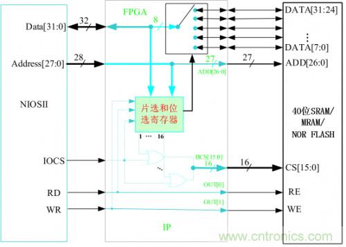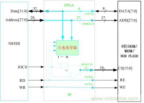 如圖4-2,SRAM、MRAM和NOR FLASH的接口操作基本一致,NIOSII的總線時序完全滿足。故在FPGA內部只要簡單的把相應的控制線和數據線相連就可以了,唯獨只要設計一個片選寄存器,用來區分SIP的16個片選。每一個片選可以訪問的空間為128MByte。片選寄存器的地址為(基址+0x0FFFFFFC),基地址設在NIOSII 外部總線的最高地址位。