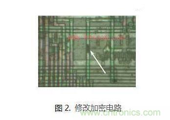 對不同芯片,提供對應(yīng)的圖紙,讓廠家做電路修改,目的是讓MCU的存儲區(qū)變得可讀。有些MCU默認不允許讀出Flash或者E2PROM中的數(shù)據(jù),因為有硬件電路做保護,而一旦切斷加密連線,程序就暴露可讀了。如圖2所示