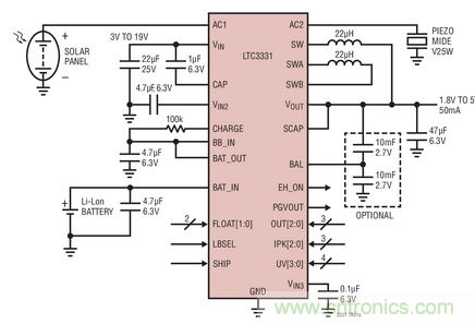 LTC3331 是一款完整的能量收集解決方案,提供高達(dá) 50mA 連續(xù)輸出電流,當(dāng)可收集能量可用時能延長電池壽命。簡便的 10mA 分流器用收集的能量給可充電電池充電,同時低電池電量斷接功能保護(hù)電池免于深度放電。當(dāng)用收集的能量向負(fù)載提供穩(wěn)定功率時,該器件僅需要電池提供 200nA 電源電流,當(dāng)在無負(fù)載情況下由電池供電時,僅需要 950nA 工作電流。LTC3331 集成了一個高壓能量收集電源、一個電池充電器和一個同步降壓-升壓型 DC/DC 轉(zhuǎn)換器,可為能量收集應(yīng)用提供一個持續(xù)穩(wěn)定的輸出,例如無線傳感器網(wǎng)絡(luò)中的能量收集應(yīng)用。能量收集電源由適合 AC 或 DC 輸入的全波橋式整流器和高效率降壓型轉(zhuǎn)換器組成,從壓電 (AC)、太陽能 (DC)、或磁性 (AC) 能源收集能量。當(dāng)沒有收集能量可用時,可充電電池輸入給降壓-升壓型轉(zhuǎn)換器供電,該轉(zhuǎn)換器在直至 4.2V 的整個電池電壓范圍內(nèi)運(yùn)行,無論輸入高于、低于或等于輸出,都可調(diào)節(jié)輸出。當(dāng)收集能源不再可用時,LTC3331 自動轉(zhuǎn)換至電池。LTC3331 的能量收集輸入在 3V 至 19V AC 或 DC 電壓范圍內(nèi)運(yùn)行,從而使該器件非常適合多種壓電、太陽能或磁性能源。其輸入欠壓閉鎖門限設(shè)定是可編程的,范圍為 3V 至 18V,從而使應(yīng)用能夠在峰值功率傳送點(diǎn)上運(yùn)行能量收集電源。其他特點(diǎn)包括引腳可編程輸出電壓和降壓-升壓峰值電流限制、一個超級電容器平衡器和一個輸入保護(hù)性分路器。LTC3331 采用耐熱增強(qiáng)型 5mm x 5mm QFN 封裝。圖 3 顯示了 LTC3331 的典型應(yīng)用電路。
