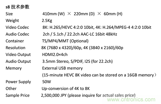 索喜科技通過搭載4枚LSI“MB86M31”組成8K HEVC實時編碼系統,配合媒體播放器s8,完成8K影像編碼、發送、解碼、顯示所有必須的影像處理,為8K影像發送提供整體解決方案。
