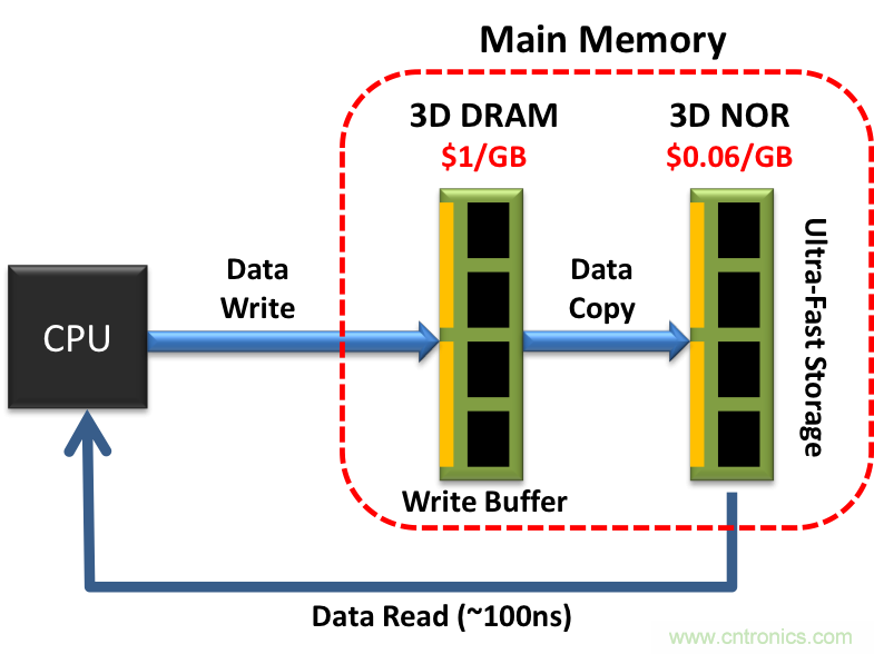 另一項(xiàng)建議是采用DDR4 NVDIMM,以取代DRAM作為主存儲(chǔ)器。非揮發(fā)性雙列直插式存儲(chǔ)器模塊(NVDIMM)有很多種類(lèi)型;相較于其他以?xún)?chǔ)存為導(dǎo)向的NVDIMM,DDR4 NVDIMM能夠表現(xiàn)得和DRAM一樣快,而且可以作為主存儲(chǔ)器。幾年前,英特爾的3D XPoint看好DDR4 NVDIMM作為切入點(diǎn),因?yàn)?D XPoint擁有NOR型閃存讀取延遲低(低于100ns)的優(yōu)點(diǎn),因而能像DRAM一樣快速運(yùn)作。它也不需要預(yù)測(cè)軟件,因而能夠始終保持高性能。此外,采用單層儲(chǔ)存(SLC)的SLC NOR閃存具有很高的耐久性。因此,DDR4 NVDIMM的NOR閃存能夠取代DRAM,并以大量的主存儲(chǔ)器大幅提升系統(tǒng)性能,如圖3所示。