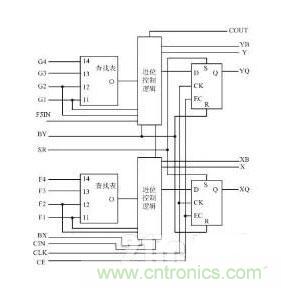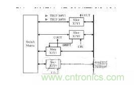 CLB是FPGA內的基本邏輯單元。CLB的實際數(shù)量和特性會依器件的不同而不同,但是每個CLB都包含一個可配置開關矩陣,此矩陣由4或6個輸入、一些選型電路(多路復用器等)和觸發(fā)器組成。 開關矩陣是高度靈活的,可以對其進行配置以便處理組合邏輯、移位寄存器或RAM。在Xilinx公司的FPGA器件中,CLB由多個(一般為4個或2個)相同的Slice和附加邏輯構成,如圖1-3所示。每個CLB模塊不僅可以用于實現(xiàn)組合邏輯、時序邏輯,還可以配置為分布式RAM和分布式ROM。