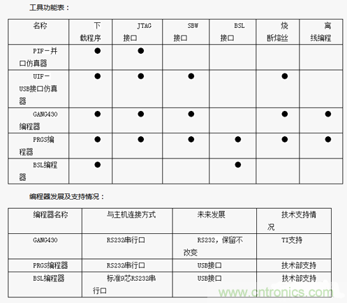 編程器型號有GANG430(RS232串行接口,串口、1拖8,支持JTAG、SBW,不支持BSL),PRGS430-IIIA多功能編程器(支持JTAG、SBW、BSL),這些編程器都可以做離線燒寫,并且支持燒寫熔絲,即脫離計算機來對目標板燒寫,其中PRGS編程器還支持序列號燒寫方式。另還有專門的BSL編程器,只支持BSL接口,不支持燒寫熔絲。