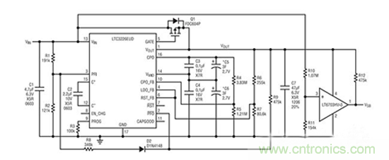 超級電容器具有緊湊、堅固和可靠的特點,并能支持用于應對短期掉電過程中后備系統的電源要求。與電池相似,它們也需要在輸出端進行謹慎的充電和功率調節。LTC®3226 是一款具有一個電源通路 (PowerPath™) 控制器的兩節串聯超級電容器充電器,可簡化后備系統的設計。特別地,該器件包含一個具可編程輸出電壓和自動電池電壓平衡功能的充電泵超級電容器充電器、一個低壓差穩壓器和一個用于實現正常模式與后備模式之間切換的電源故障比較器。低輸入噪聲、低靜態電流和緊湊的占板面積使 LTC3226成為緊湊、手持和電池供電型應用的理想選擇。這款器件采用3mm x 3mm 16引腳QFN封裝。
