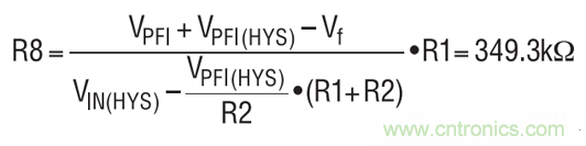 VIN 引腳上的遲滯必需延長以滿足 3.6V 的觸發電平。這可以通過在 PFI 引腳和 PFO 引腳之間增設一個電阻器與二極管的串聯組合來實現。VIN(HYS) 為0.5V,VPFI(HYS)為20mV,而Vf為0.4V。