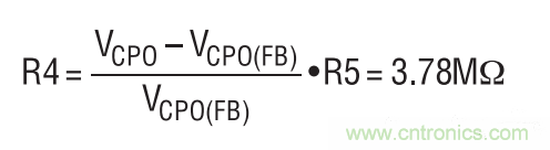 串聯連接的超級電容器上的滿充電電壓被設定為5V。這是利用位于 CPO 引腳與 CPO_FB 引腳之間的一個分壓器網絡完成的。R5 設定為 1.21M,并計算 R4阻值。VCPO(FB)為1.21V。