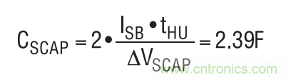 在后備模式中,當超級電容器組上的電壓開始接近VOUT 時,在計算 tHU 結束時超級電容器上的最小電壓必須將兩個超級電容器的 ESR 和 LDO 的輸出電阻考慮在內。假設每個超級電容器的 ESR 為 100mΩ,而 LDO 輸出電阻為 200mΩ,這將由于 50mA 待機電流的原因而使VOUT (MIN)增加20mV。VOUT (MIN)設定為3.1V,從而在超級電容器組上產生一個1.88V的放電電壓 (?VSCAP)。現在,可以確定每個超級電容器的大小。