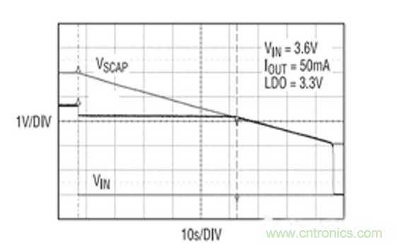 圖 1 示出了一款采用超級電容器組的電源保持系統,該電容器組在沒有電池電源的情況下提供持續約45s 的 165mW 待機功率的容量。一個 LDO 負責在后備模式期間將超級電容器組的輸出轉換為一個恒定電壓電源。