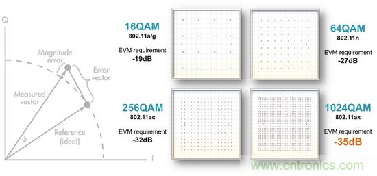評估手機Wi-Fi發射信號質量的主要指針是誤差向量幅度(EVM)。EVM反映了手機發射機信號IQ調變偏離理想值的程度。EVM越高,信號質量越差,再經過無線通道的衰減之后,路由器接收機就很難正常解調該信號,造成封包遺失和重傳,從而延長了傳輸延遲。因此,我們期望在手機發射端的信號質量盡可能好,才能確保傳輸的穩定和低延遲。在手機生產制造過程中,我們使用VSA儀器對手機發射機發出的RF信號進行解調分析,即可計算出EVM值。