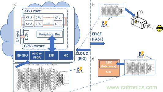 在圖1a中,云數據中心服務器利用在大型大數據集上訓練的深度學習神經網絡來執行機器學習的功能。在圖1b中,邊緣設備中的安全攝像機采用經過大數據訓練的推理引擎來實時識別圖像(快速數據)。在圖1c中,智能固態硬盤設備采用推理引擎進行數據識別和分類,從而有效地利用了此設備的帶寬。圖1展示了RISC-V內核的潛在機會,它可以自由地添加專有的及未來標準化的矢量指令,這些指令對于處理深度學習和推理技術相當有效。