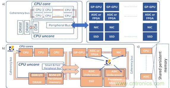 在圖2a中,傳統的計算體系結構由于把一條慢速外設總線用于快速存儲器及計算加速設備,其能力已達到其極限。在圖2b中,未來的計算體系結構采用了開放接口,能夠為平臺上所有的計算資源提供統一并支持高速緩存一致性的訪問方式來訪問共享持久內存,(這稱為以數據為中心的體系結構)。在圖2c中,所部署的設備能夠使用相同的共享內存,從而減少了不必要的數據復制。