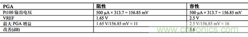 表 2 總結(jié)了阻性 PGA 相對(duì)于容性 PGA 的最大增益,最大電流源為 500 µA,限制了 Pt100 的自發(fā)熱(假定 B 類(lèi) RTD,此時(shí)最高溫度為 600°C,最大 VREF 為 2.5 V)。