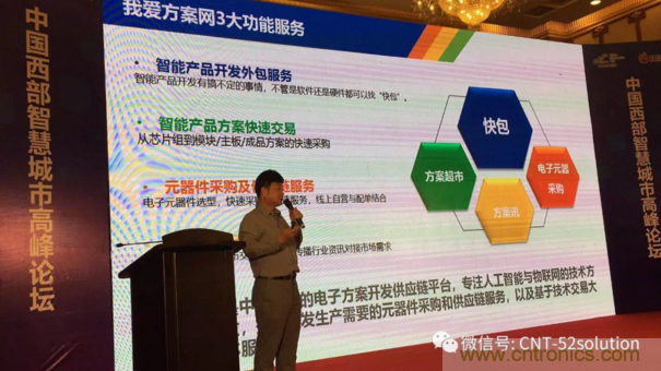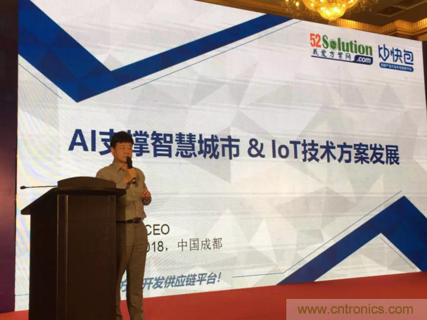 【導讀】為服務西部產業創新,中電網絡技術/我愛方案網攜手四川本地技術服務商與中國電子信息博覽會來到成都,我愛方案網的CEO劉杰博士在2018中國智慧城市高峰論壇做大會報告,圍繞“AI支撐智慧城市和IoT技術方案發展”做了主題講演。