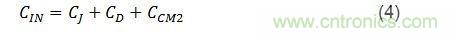 從圖中可以清楚地看出,CJ、 CD和CCM2是并聯,因此反相輸入端電容為:
