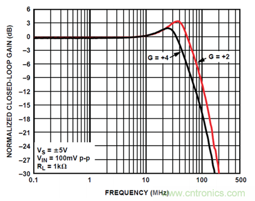 圖 1 所示增益可選放大器采用了一種創(chuàng)新的開關(guān)技術(shù),可以保持 ADA4896-2 的 1 nV/√Hz噪聲性能,同時降低非線性增益誤差。利用這種技術(shù),用戶可以選擇電容最小的開關(guān)來使電路的帶寬最大化。