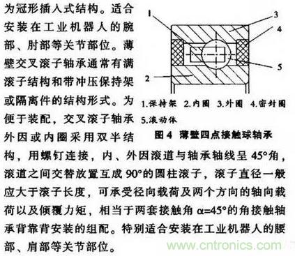 球軸承是機器人和機械手機構中最常用的軸承。它能承受徑向和軸向載荷,摩擦較小。其機器人專用軸承四點接觸式設計以及高精度加工。這種軸承比同等軸徑的常規中系列四點接觸軸承輕25倍。它的內圈(或外圈)由兩個半圈精確拼配而成,而其整體外圍(或內圈) 的溝曲率半徑較小,使鋼球與內、外圈在四個“點”上接觸。既加大了徑向負荷能力,又能以緊湊的尺寸承受很的兩個方向的軸向負荷,并且有很好的兩個方向的軸向限位能力,因為它的軸向游隙相對較小。而其接觸角 (一般取為35)又較大。工業機器人專用薄壁四點接觸球軸承通常有帶密封圈和不帶密封圈的結構形式(見圖4)。其主要由內圈、外 圍、保持架、鋼球或非接觸式密封圈組成。內、外圈均為整體結構。鋼球與內、外因溝道呈四點接觸.保持架為冠形插入式結構。