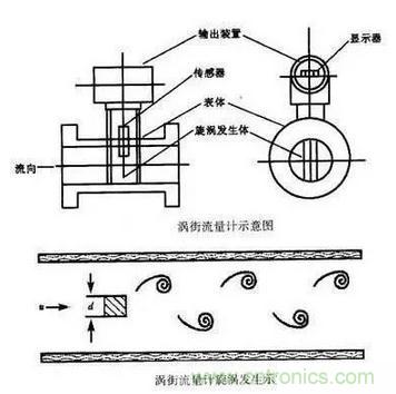 渦街流量計是在流體中安放一根非流線型游渦發生體,流體在發生體兩側交替地分離釋放出兩串規則地交錯排列的游渦的儀表。渦街流量計按頻率檢出方式可分為:應力式、應變式、電容式、熱敏式、振動體式、光電式及超聲式等。