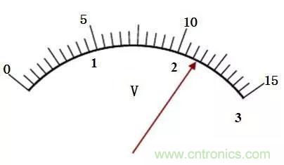 若是0~15V檔,最小分度值為0.5V, 半格為0.25V,通常可估讀為0.2V或0.3V。(因有效數字出現在以V為單位的十分位上)。圖中讀數應為 11. 2V或11.3V。