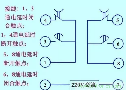 6-8腳為通電延時斷開觸點,接通電源,給了信號之后線圈得電,等到設置時間到達以后,觸點斷開;