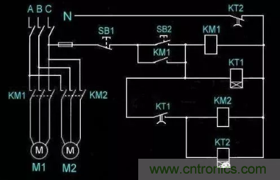 各個引腳的含義我們已經搞清楚了,下面就可以根據控制原因進行接線,我們以下圖為例,在電路中加入KT通電延時時間繼電器,當按下啟動按鈕SB2線圈KT1、KM1得電交流接觸器KM1吸合,電動機M1轉動,延時閉合開關KT1到達時間吸合,KM2、KT2得電,交流接觸器KM2得電吸合,電動機M2轉動,延時斷開開關KT2在到達時間以后斷開,整個控制回路斷開,所有電機停止轉動;
