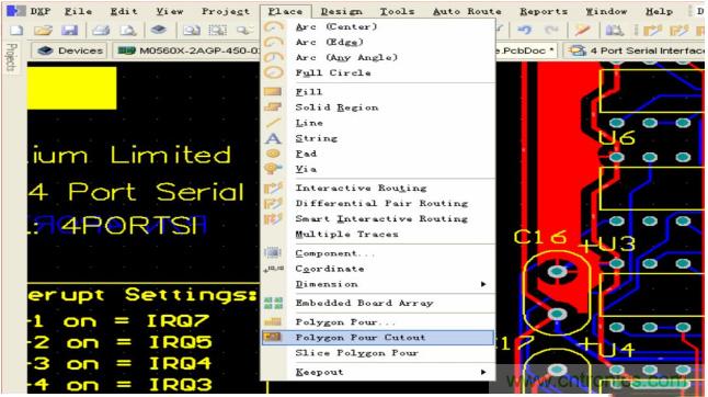有時我們在鋪完銅之后還需要去刪除一些碎銅,現在可以很方便的實現,點擊 Place—Polygon Pour Cutout