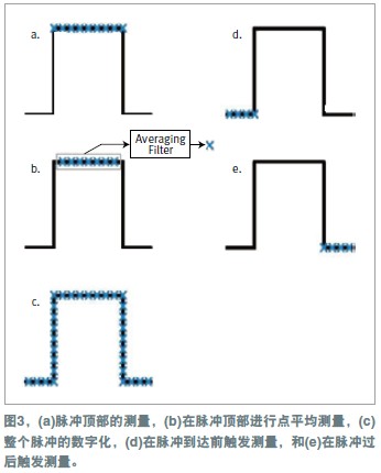 有時可以用脈沖來向器件提供功率應力。在這些應用中,在施加應力前記錄器件的狀態(tài)非常有用。這可以通過如下方法來實現:編程設定一個具有非零空置電平(idle level)的脈沖,并在觸發(fā)脈沖前先觸發(fā)測量操作(圖3d)。用戶可以規(guī)定脈沖出現前多長時間應該啟動測量??梢岳枚〞r器來對測量的起點以及脈沖的起止點進行編程設定。