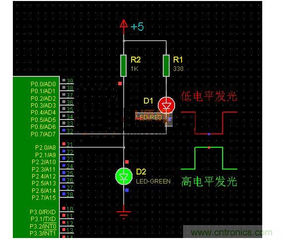 圖1中的D1、D2就可以不經其它驅動器件,直接由單片機的引腳控制發光顯示。雖然引腳已經可以直接驅動LED發光,但還是看看AT89C51單片機引腳的輸出能力吧。