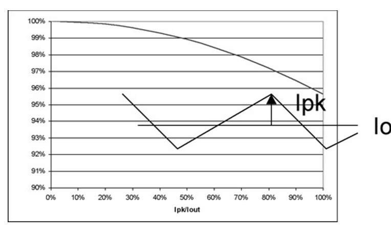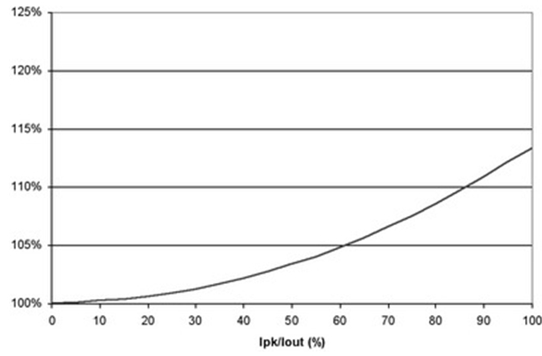圖4 也闡明了即使在紋波電流較大的時(shí)候,對(duì)功耗也沒有重大影響。例如,50%的紋波電流僅增加不足5%的功率損耗。當(dāng)大大超過此水平時(shí),需要減小電源的DC電流以保持結(jié)溫不變,從而維持半導(dǎo)體的使用壽命。經(jīng)驗(yàn)法則顯示,結(jié)溫每降低10%,半導(dǎo)體使用壽命就會(huì)延長(zhǎng)兩倍。并且,許多設(shè)計(jì)都傾向于更小的紋波電流,這是因?yàn)殡姼衅鞯南拗啤=^大多數(shù)電感的設(shè)計(jì)處理能力小于20%的Ipk/Iout紋波電流比率。