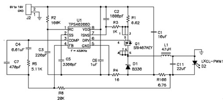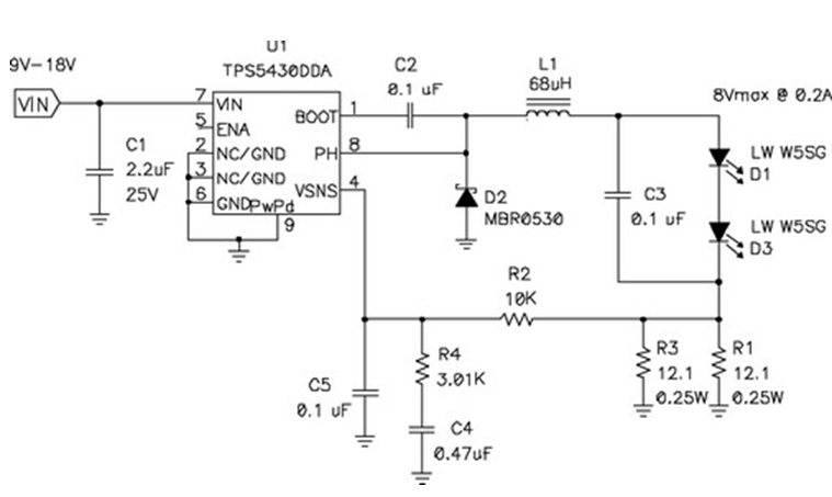 在輸出電壓始終小于輸入電壓的情況下,應(yīng)使用降壓穩(wěn)壓器,圖5顯示了該拓?fù)浣Y(jié)構(gòu)。在該電路中,對(duì)電源開關(guān)的占空比 (duty factor) 進(jìn)行了控制,以在輸出濾波器電感 L1 上確立平均電壓。當(dāng)FET開關(guān)閉合時(shí)(TPS5430 內(nèi)部),其將輸入電壓連接到電感器,并在L1中構(gòu)建電流。D2為環(huán)流二極管 (catch diode),可提供開關(guān)斷開時(shí)的電流路徑。電感器可對(duì)流過LED的電流起到平滑的作用,該工作可通過用電阻監(jiān)控(測(cè)量)LED電流,并將電壓與控制芯片內(nèi)部的參考電壓進(jìn)行比較,最終進(jìn)行調(diào)節(jié)。如果電流太低,則占空比增加,平均電壓也上升,從而也導(dǎo)致了電流的升高。該電路具有極佳的效率,因?yàn)殡娫撮_關(guān)、環(huán)流二極管以及電流感測(cè)電阻上的壓降非常低。