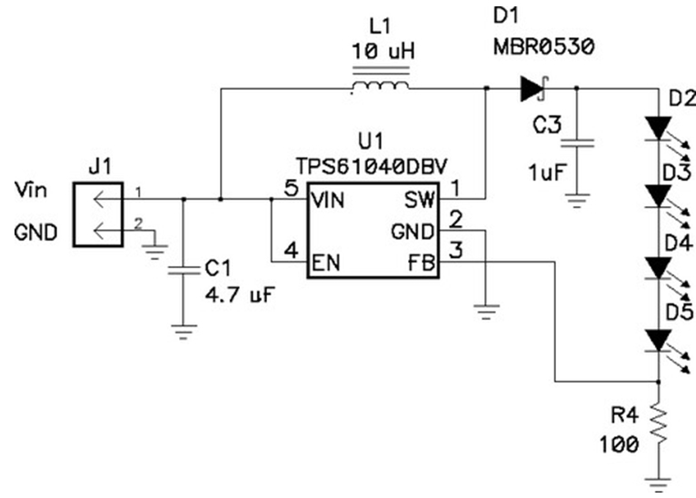 當(dāng)輸出電壓總是比輸入電壓大時(shí),最好采用升壓轉(zhuǎn)換電路,如圖6所示。該電路的U1有一個(gè)帶有控制電子器件的高度集成的電源開關(guān)。當(dāng)開關(guān)閉合時(shí),電流流過電感器到接地。當(dāng)開關(guān)斷開時(shí),U1的引腳 1 電壓會(huì)升高,直到D1導(dǎo)通。然后電感器放電,電流進(jìn)入輸出電容器(C3)和LED串。在絕大多數(shù)應(yīng)用中,C3通常用于平滑LED電流。如果沒有C3,則 LED電流將是斷斷續(xù)續(xù)的。也就是說,它會(huì)在零和電感電流之間切換,這會(huì)導(dǎo)致 LED 熱量增加(從而縮短使用壽命),亮度減少。在前面的例子中,LED 的電流是通過一個(gè)電阻感測(cè)的,并且占空比會(huì)發(fā)生相應(yīng)的變化。請(qǐng)注意,本拓?fù)浯嬖谝粋€(gè)嚴(yán)重的問題,即它沒有短路保護(hù)電路。若輸出短路,則會(huì)有較大的電流通過電感器和二極管,從而導(dǎo)致電路失效,或者輸入電壓崩潰。