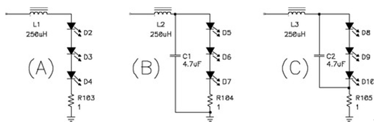 關(guān)閉 LED 電源上的電流環(huán)路比關(guān)閉傳統(tǒng)電源上的電壓環(huán)路簡(jiǎn)單。環(huán)路的復(fù)雜性取決于輸出濾波器的配置。圖8顯示了三種可能的配置:只有一個(gè)簡(jiǎn)單電感器的濾波器(A);一個(gè)典型的電源濾波器(B);以及一個(gè)修正后的濾波器(C)。