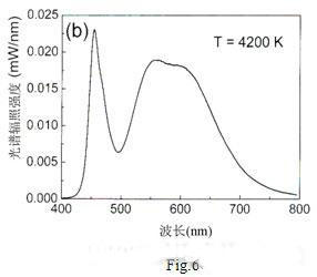 InGaN藍光LED1號熒光粉制成的白光LED的發射光譜示如Fig.6,其光效為55lm/W,色溫4500K。這是本人所知道白光LED的最高光效報導(據測試國內1W白光LED的光通量大多在40lm以下)。采用2號和3號混合熒光粉試制的白光LED的發射光譜示如Fig.7,其顯色指數提高到82,色溫4200K,但光效確降低到20lm/W