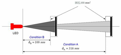 如圖4所示,點光源光強在空間各方向均勻分布,在不同距離處用不同接收孔徑的探測器接收得到的測試結果都不會改變,但是LED由于其光強分布的不一致使得測試結果隨測試距離和探測器孔徑變化。因此,CIE-127提出了兩種推薦測試條件使得各LED在同一條件下進行光強測試與評價,目前CIE-127條件已經被各LED制造商和檢測機構引用。