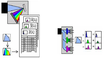 LED的顏色特性主要包括色品坐標、主波長、色純度、色溫及顯色性等,LED的顏色特性對白光LED尤為重要。 現有的顏色特性測試方法有分光光度法和積分法。如圖7所示:分光光度法是通過單色儀分光測得LED光譜功率分布,之后利用色度加權函數積分獲得對應色度參數;積分法是利用特定濾色片配合光電探測器直接測得色度參數;分光光度法的準確性要大大高于積分法。