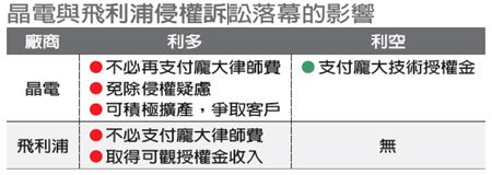 在雙方達(dá)成和解后,晶電同時取得飛利浦的AlInGaP發(fā)光二極管的技術(shù)授權(quán),授權(quán)條件則不予揭露。至于晶電與日廠日亞化(NICHIA)有關(guān)藍(lán)光LED的兩起侵權(quán)官司,則早已和解、撤銷,隨與飛利浦間的侵權(quán)訴訟落幕,晶電目前再無侵權(quán)訴訟案纏身。