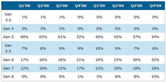 表一 : Q1’08到Q4’09桌上型顯示器面板各世代線的產(chǎn)出比例