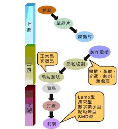 (二)中游:主要產品為晶粒。依LED不同需求進行磊芯片擴散、金屬蒸鍍、再在磊芯片上光罩、蝕刻、熱處理,制成晶粒電極,最后經過晶粒切割、測試、檢驗后完成。