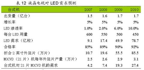 表4 臺式電腦液晶顯示器對LED需求預測