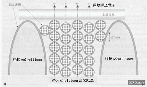 BSD是將silicon奈米結(jié)晶化形成鎖鍊狀結(jié)構(gòu),藉此使電子呈彈道狀移動(dòng),一般將此現(xiàn)象稱為彈道電子輸送。圖1是BSD電子源的動(dòng)作機(jī)制說明圖,基本上它是在柱狀polysilicon之間形成電子drift層,polysilicon與奈米結(jié)晶silicon混合的systemunit稱為NPS層(NanocrystallinePoly-Siliconlayer),雖然NPS層是利用陽(yáng)極氧化技術(shù)制成,不過在polysilicon的結(jié)晶粒界的glen部位會(huì)產(chǎn)生快速反應(yīng),因此polysilicon結(jié)晶粒的表面,支配性形成奈米結(jié)晶silicon,使得NPS層內(nèi)殘留的silicon結(jié)晶粒比奈米結(jié)晶silicon多,該殘留的柱狀polysilicon可幫助散熱,進(jìn)而提高冷陰極的電子熱傳導(dǎo)穩(wěn)定性,所以BSD釋放電子時(shí)幾乎不會(huì)產(chǎn)生閃爍噪訊(flickernoise)。