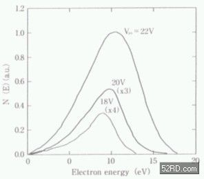 圖2是釋放至真空中的電子能量分佈量測(cè)結(jié)果,圖中的x軸為電子能量,y軸為釋放電子的相對(duì)數(shù),測(cè)試時(shí)的基準(zhǔn)能量是比照真空狀態(tài)時(shí)的準(zhǔn)位,測(cè)試方法是在室溫下進(jìn)行,採(cǎi)用一般性的交流減速電界法。假設(shè)表面金屬的動(dòng)作關(guān)數(shù)為ψ(eV)時(shí),完全未發(fā)生沖突釋放出去的電子最大能量,理論上幾乎等于施加電壓減去動(dòng)作關(guān)數(shù)ψ的能量,以圖2為例假設(shè)VPS=22V時(shí),雖然分佈的最大能量-Vmax祇有17eV,不過表面電極的動(dòng)作關(guān)數(shù)大約有5eV,換言之它與上述施加電壓減去動(dòng)作關(guān)數(shù)的結(jié)果完全一致,由此驗(yàn)證BSD具有獨(dú)特的彈道電子釋放特性。實(shí)際上在室溫環(huán)境下NPS層多少會(huì)發(fā)生沖突,一般是將它視準(zhǔn)彈道電子的釋放。