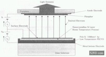 綜合以上的說明可知BSD的電子釋放機(jī)制,是當(dāng)電壓注入上方電極與背面基板之間時(shí),下方鋁質(zhì)電極所產(chǎn)生的電子會(huì)注入PPS層內(nèi)的微結(jié)晶硅,而電子通過微結(jié)晶硅內(nèi)部時(shí)幾乎沒有能量損耗(energyloss),主要原因是一旦施加電界后,微結(jié)晶硅表面的氧化膜會(huì)使電子加速。此外一般硅內(nèi)部的平均自由行程約為50nm,而微結(jié)晶硅的glensize祇有5nm。由于當(dāng)電子通過PPS層時(shí),幾乎不會(huì)與其它電子或硅原子發(fā)生沖突,因此電子通過微結(jié)晶硅內(nèi)部時(shí),能量損耗幾乎等于零,使得到達(dá)上方金屬電極的電子能量減去金屬的動(dòng)作關(guān)數(shù)值最大可達(dá)14~15eV,這種現(xiàn)象稱為彈道電子傳導(dǎo)效應(yīng)。以往的彈道電子傳導(dǎo)效應(yīng)必需在真空環(huán)境下才會(huì)發(fā)生,不過BSD利用多孔化(porous)將復(fù)晶硅膜(polysilicon)包覆,因此它可在固體中產(chǎn)生彈道電子釋放現(xiàn)象。利用這樣的特性制作FED時(shí)可使已加速的電子,在cellgap內(nèi)部呈垂直狀發(fā)射出,并使電子撞擊正面基板表面上的螢光體產(chǎn)生影像。由于BSD的電子發(fā)射源可將電子呈垂直狀發(fā)射出去,因此cellgap高達(dá)數(shù)mm的高電壓型FED,也不需要設(shè)置電子束收歛電極防止失真(crosstalk)現(xiàn)象。
