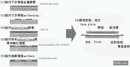 表3是負(fù)極基板的制作流程,表中左側(cè)是利用BSD試作FED的制程條件,右側(cè)是未來商品化時(shí)的預(yù)定制造方法。