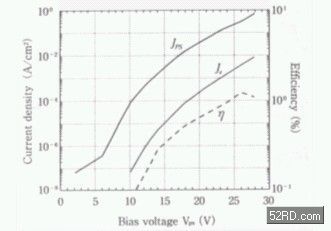 圖6是典型的BSD電子源的電壓?電流特性圖,圖中的橫軸為電壓,縱軸為電流密度,JPS是二極體(diode)的電流密度,JPS表示從二極體表面金屬膜層釋放至真空中的電子emission電流密度,一般emission電流祇能在VPS為正方向時(shí)才能觀測(cè)到。由圖可知隨著電壓增加,二極體的順向電流與釋放電流亦增大,當(dāng)順向電壓為28V時(shí)emission電流密度約為8.9mA/cm²,emission效率約為1.2%左右。