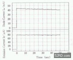 圖7是BSD電子源的emission電流時(shí)間變化特性圖,橫軸為時(shí)間,縱軸為電流密度,二極體電壓為16V,如圖所示二極體電流IPS與釋放電流Ie,不會(huì)隨著電流發(fā)生spike,亦即所謂的閃爍(flicker)現(xiàn)象,顯示BSD電子源不需外部電路,就可獲得傳統(tǒng)Spendtype電子源無法達(dá)成的特性。