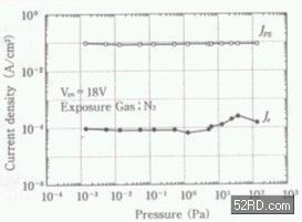 圖8是BSD電子源的周圍真空度發(fā)生變化時(shí)的emission電流變化特性,具體測(cè)試方法是將爐內(nèi)更換成氮素,接著抽真空至10-4Pa再逐漸導(dǎo)入氮素,藉此觀察真空度變化時(shí)的emission電流變化,圖中的橫軸為真空度,縱軸為二極體(diode)的電流密度,由圖可知即使真空度降至10-4,emission的電流密度幾乎無任何改變,顯示BSD電子源在真空度非常惡劣的環(huán)境下,仍具備良好的emission特性。