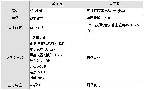 上述第1與第4項(xiàng)之流程系使用現(xiàn)有的成膜技術(shù)與材料;第2與第3項(xiàng)則為松下公司開發(fā)的多孔化PPS技術(shù)。有關(guān)第2項(xiàng)復(fù)晶硅膜制程必需將作業(yè)溫度與壓力等參數(shù)作最佳化組合,如此便可使蘇打石玻璃在450°C~550°C的低溫環(huán)境下完成長(zhǎng)膜作業(yè)。第3項(xiàng)的電解液、液溫、電流密度等參數(shù)經(jīng)過作最佳化后,在一定條件下進(jìn)行陽(yáng)極氧化,之后必需再度更改制程參數(shù)(processparameter)才可再進(jìn)行陽(yáng)極氧化作業(yè)。