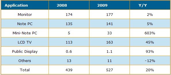 雖然液晶顯示器對大尺寸液晶面板而言是一個較成熟的市場,2009年出貨量僅較2008年成長2%,而與2007年相同。筆記型計算機與迷你筆記本電腦用面板合計出貨達一億7千500萬片,2009年年成長率約25%。電視面板表現最為亮眼,出貨量成長45%,達1億6千300萬片。另外,公眾顯示器面板出貨成長93%,從90萬片成長到110萬片。