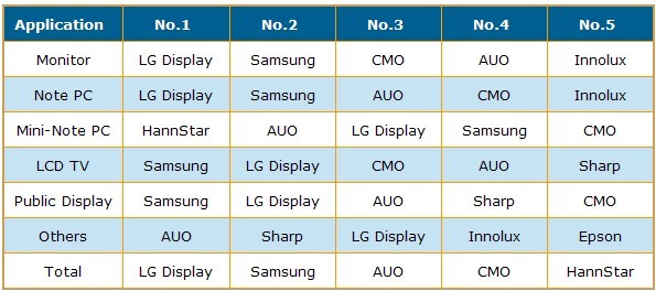 以2009年大尺寸液晶面板出貨片數排名來看,LGD以市占率24.9%居冠,而Samsung以0.4%些微差距居次,市占率24.5%,AUO市占率為17%,CMO市占率為14.2%。以出貨面積與出貨金額來看,則是由Samsung居冠。以地區別來看,2009年韓國面板廠出貨面積有大幅提高,從2008年的46.2%,成長到2009年的52.8%。
