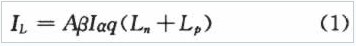 式中,A為p-n結面積,q是電子電量,Ln、Lp分別為電子和空穴的擴散長度,J表示以光子數計算的平均光強,α為p-n結材料的吸收系數,β是量子產額,即每吸收一個光子產生的電子一空穴對數。